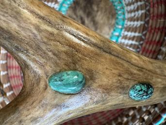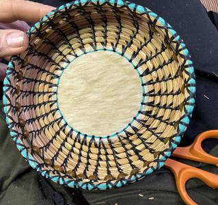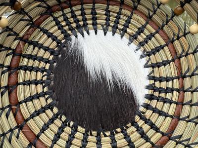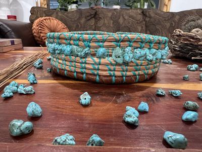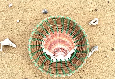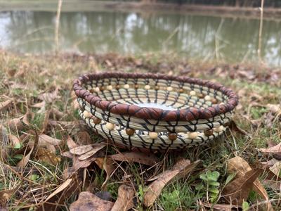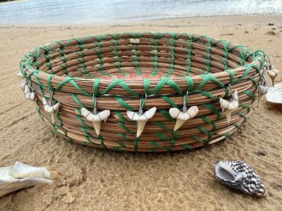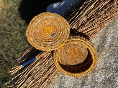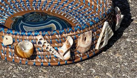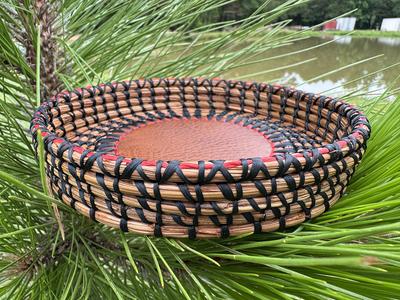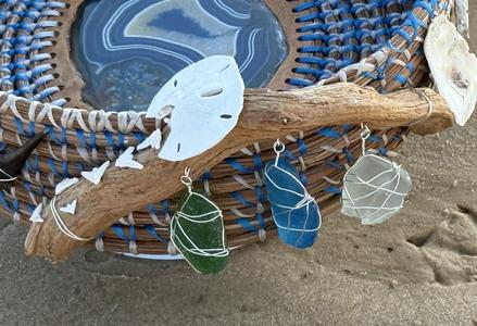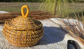 Hand woven long leaf pine needle, accented with items from nature;